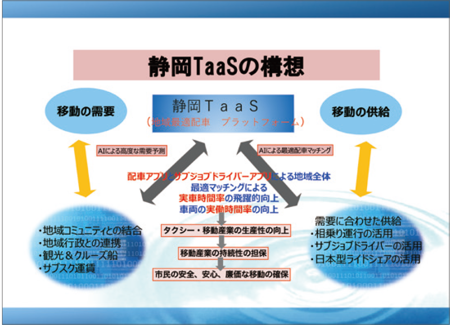 自分も静岡TaaSの事業構想のキーワードとして【AIによる高度な需要予測】と【AIによる最適配車マッチング】を、目指すべきタクシー移動産業の生産性向上のための【地域全体最適配車プラットフォーム】構築のキラーコンテンツとして標榜してきた。